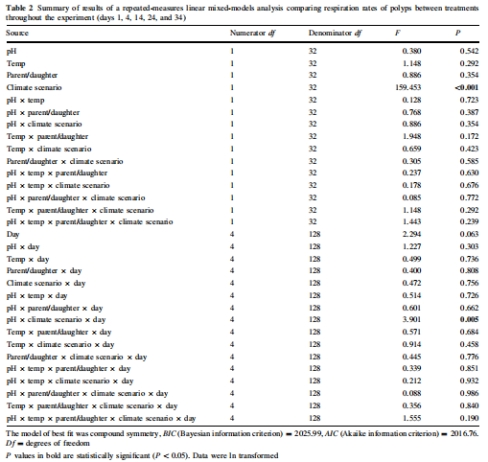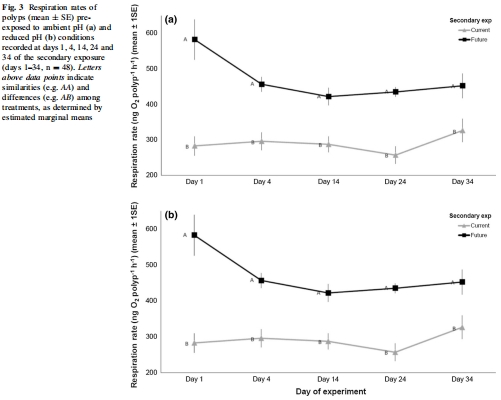 數(shù)據(jù)來源:預(yù)暴露于不同pH條件的息肉在不同氣候情景下隨時(shí)間變化的呼吸速率展示在 文檔圖3a和3b中。統(tǒng)計(jì)結(jié)果總結(jié)在 文檔表2。