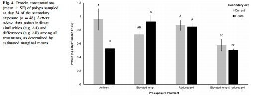 研究意義:蛋白質(zhì)濃度是生理狀況和生物量的良好指標(biāo)。濃度的變化可以反映能量分配策略的改變,例如,是否將資源從蛋白質(zhì)合成轉(zhuǎn)向應(yīng)急代謝。結(jié)果顯示,預(yù)暴露處理顯著影響了蛋白質(zhì)積累,雙重預(yù)暴露處理下的息肉蛋白質(zhì)濃度最低。