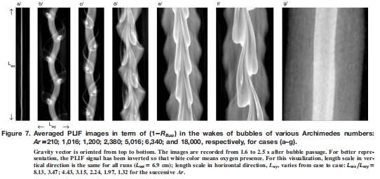 數據來源:不同阿基米德數下氣泡尾流的氧分布(以1-R_fluo表示)展示在 文檔圖7中。氣泡輪廓與氧分布疊加圖展示在 文檔圖8中。