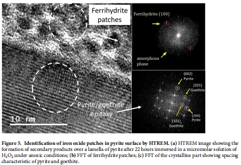 研究意義:直觀地展示了表面反應產生的納米級次生產物。HRTEM圖像清晰地顯示,在黃鐵礦表面形成了低結晶度的納米簇(文檔圖5a),其傅里葉變換(FFT)圖樣與水鐵礦(ferrihydrite)等鐵(羥基)氧化物吻合(文檔圖5b, c)。這為表面氧化過程提供了直接的形貌學證據,表明反應不僅發生在溶液均相,也深刻改變了礦物表面的微觀結構。