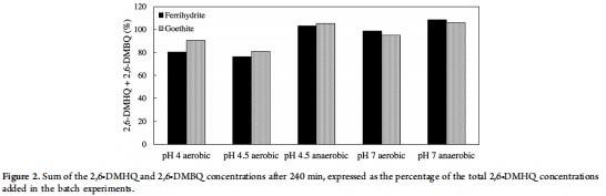 數據內容:2,6-DMBQ回收率不完全(pH 4.5時有氧條件下約75%),表明存在副反應;pH 7.0時回收率接近100%。
