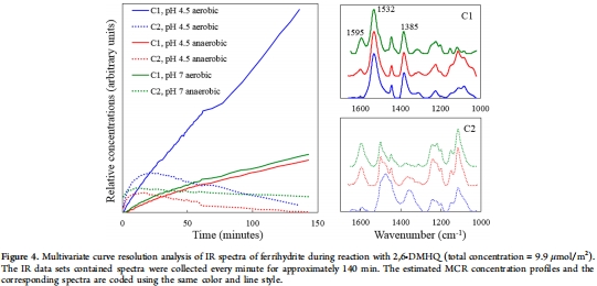 數據內容:MCR-ALS解析出兩個主要表面物種:C1(1385、1532 cm?1波段)歸屬副反應產物,C2在pH 7.0時類似2,6-DMHQ,pH 4.5時含半醌特征(1500 cm?1)。