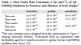 數據內容:有氧條件下,水鐵礦和針鐵礦使氧化速率常數提高1–2個數量級(如pH 4.5時,水鐵礦k=1.2×10?1 min?1,針鐵礦k=3.0×10?2 min?1,自氧化k=7.2×10?? min?1);厭氧條件下速率顯著下降(如pH 4.5時,水鐵礦k=2.2×10?2 min?1,針鐵礦k=1.6×10?3 min?1)。