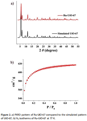 研究意義:證實嵌入釕催化劑后,MOF主體框架的晶體結構和多孔性得以保持。PXRD圖譜(文檔圖2a)與模擬的UiO-67譜圖吻合,證明催化劑成功嵌入且沒有破壞晶體結構。N?吸附等溫線(文檔圖2b)顯示材料具有高比表面積,表明其具有多孔特征,這對于反應物和電荷的傳輸至關重要。