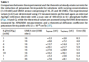 數(shù)據(jù)來源:不同濃度鐵氰化鉀下的CV曲線以及穩(wěn)態(tài)電流與濃度/微電極數(shù)量的關(guān)系圖展示在 文檔圖4中。具體的實驗與理論電流值對比列于 文檔中表1。