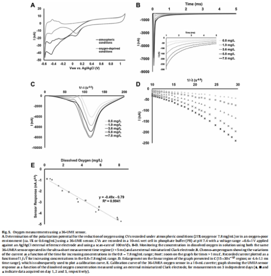 本研究報道了一種新穎的傳感協(xié)議,該協(xié)議基于超短時間測量(<5毫秒),并采用一種專用的超微電極陣列(UMEA)傳感器,用于監(jiān)測溶液中的溶解氧濃度。該UMEA傳感器由鉑(Pt)制成,以氧化物-氮化物-氧化物(ONO)作為絕緣材料,電極凹嵌在玻璃基底中。傳感器在其線性區(qū)域內(nèi)工作,溶液中的氧濃度可在不到5毫秒內(nèi)從測得的電流(I)與時間的平方根倒數(shù)(1/√t)關(guān)系曲線的斜率中推導(dǎo)出來。為驗證所提出的測量協(xié)議并校準(zhǔn)傳感器,在一個10毫升的濕池中,使用UMEA傳感器和一個外部的電化學(xué)傳感器同步監(jiān)測溶解氧濃度的變化。兩種傳感器的測量結(jié)果表現(xiàn)出極好的一致性(R2 = 0.994),并確定UMEA傳感器在此超短測量模式下的靈敏度為0.49 nA·s??.? / mg/L。最終,也是最重要的一點,在這種配置下進行電化學(xué)測量所消耗的氧氣量被極大地減少了,與商用電化學(xué)傳感器相比減少了約10個數(shù)量級,這對于在微流控系統(tǒng)中原位監(jiān)測納升級體積內(nèi)微組織(如細(xì)胞團)的呼吸活性具有極高價值。