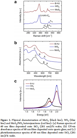 數(shù)據(jù)內(nèi)容:Raman光譜顯示MoS?和WS?特征峰(E??g和A?g)能量差分別為20–24 cm?1和66–68 cm?1,表明少層結(jié)構(gòu);UV-vis吸收峰位(MoS?: 676 nm, WS?: 628 nm)確認可見光吸收。