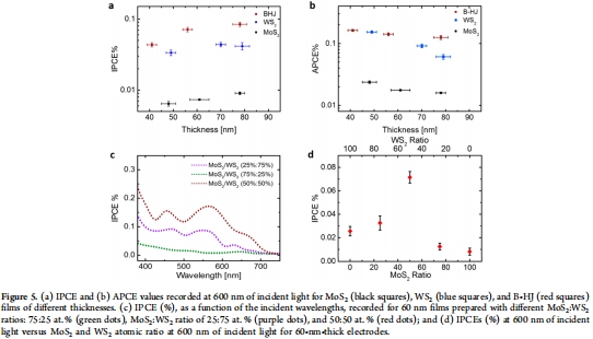 數(shù)據(jù)內(nèi)容:MoS?:WS?原子比為50:50時IPCE最高;75:25或25:75比例效率較低。