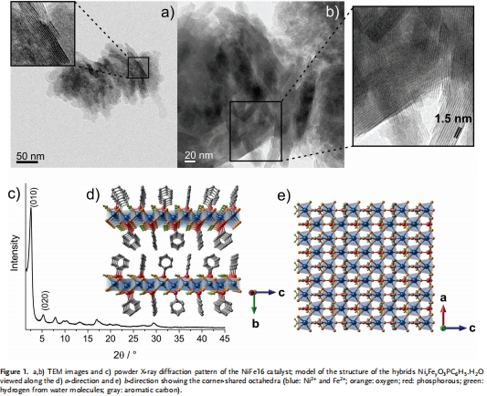 本文報道了一種基于混合有機-無機過渡金屬膦酸鹽(NiFe-苯基膦酸鹽)的水氧化電催化劑。通過微波輔助合成法制備了層狀結構的NiFe-苯基膦酸鹽化合物,其在堿性介質中作為前驅體,原位轉化為NiFe氫氧化物納米片(尺寸5-25 nm,厚度3-10 nm)。該催化劑在氧析出反應(OER)中表現出高活性,在Fe含量為16%時最優,可在240 mV過電位下產生10 mA cm?2電流密度,并具有160小時的長期穩定性。研究通過X射線吸收光譜(XAS)等手段證實,膦酸鹽前驅體不僅模板化納米片形成,還保留了金屬位點的扭曲八面體配位環境,從而增強催化效率。