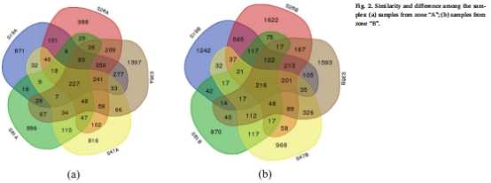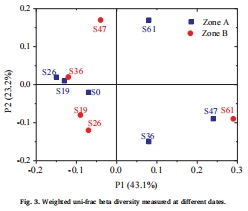 數據內容:Venn圖顯示A區樣本共享OTU為227,獨有OTU最高達1397(S36A);B區共享OTU為216,獨有OTU最高達1622(S26B)。PCoA分析表明隨運行時間延長,A/B區樣本間距離顯著增大(圖3)。