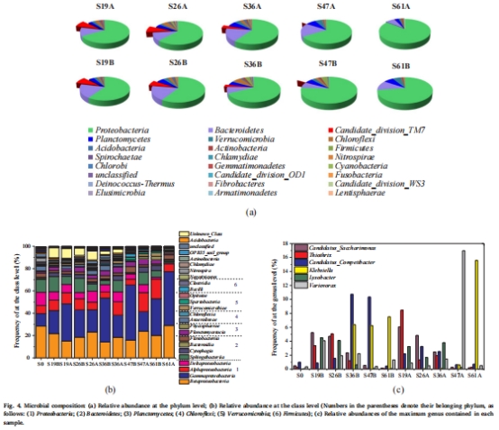 數據內容:Proteobacteria為優勢門(A區從61.1%增至82.5%,B區從60.8%增至67.9%);屬水平上Candidatus_Saccharimonas(TM7門)在早期主導(S19A: 6.1%),后期被Klebsiella(S61A: 15.6%)和Variovorax(S47A: 17.0%)替代。