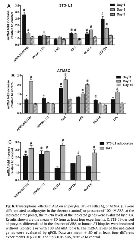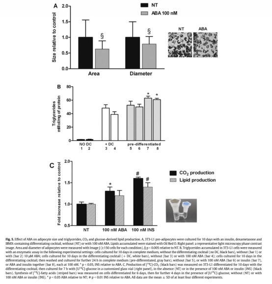 5 代謝產物測量:ABA減少脂肪細胞甘油三酯積累,但增加CO2產生,表明葡萄糖氧化增強而非脂質儲存。數據來自圖5。研究意義:反映ABA促進能量消耗型代謝,與棕色化表型相符,可能減少脂質蓄積。