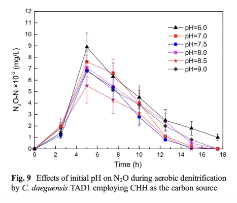 使用丹麥Unisense電極精確測量N2O濃度,其研究意義在于直接量化好氧反硝化過程中的溫室氣體排放,為評估TAD1菌的環境友好性提供關鍵證據。該電極的高靈敏度使研究人員能夠捕捉N2O的動態變化(如圖9顯示pH 8.5時峰值僅0.053%),證明CHH作為碳源可有效抑制N2O還原酶的氧敏感性,減少中間產物積累。這一數據不僅驗證了低溫室氣體排放的優勢,還為高溫廢水處理工藝的低碳化設計提供了實證依據,凸顯了CHH在應對氣候變化中的實際價值。