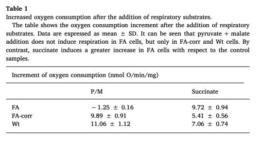 1 氧消耗測量:使用Unisense電極測量細胞呼吸。數據顯示FA細胞基礎氧消耗低于對照組,對pyruvate+malate(激活復合物I-III-IV通路)的反應弱,但對succinate(激活復合物II-III-IV通路)的反應增強。這些數據來自Fig.1和Table 1。研究意義:表明FA細胞線粒體復合物I-III通路受損,但復合物II-IV通路代償性激活,揭示了OXPHOS缺陷的具體機制,為代謝重組提供證據。