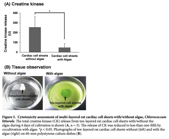 2 代謝物分析:測量葡萄糖消耗、乳酸產生和氨含量。共培養使多層心肌組織的葡萄糖消耗和乳酸產生顯著降低,乳酸/葡萄糖比率從約1.8降至1.4,表明代謝從無氧呼吸轉為有氧呼吸。氨含量減少至單獨培養的1/7-1/8。這些數據來自圖3和表2。研究意義:顯示共生系統改善了組織代謝環境,藻類利用哺乳動物細胞的代謝廢物(如氨),實現了營養回收。