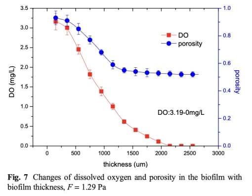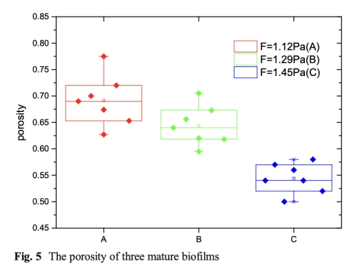 2 孔隙率:數據來自圖5、6、7、8,顯示孔隙率隨壁面剪切應力增加而降低(從69.1%到55.1%)。研究意義是孔隙率決定氧氣和底物在生物膜內的傳遞能力,影響微生物的分布和代謝活動。