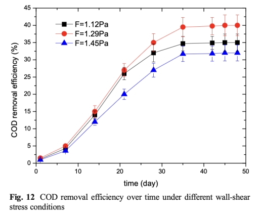 6 COD去除效率:數據來自圖12,顯示效率隨剪切應力增加而降低(從40%到32%)。研究意義是COD去除效率綜合反映生物膜的整體性能,與孔隙率、OUR和微生物結構協同作用,為下水道優化設計提供依據。