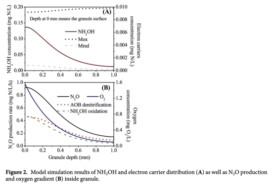 4 顆粒內部底物分布(如NH2OH、電子載體、氧氣)和N2O產生速率:數據來自圖2。研究意義是模擬顆粒內部的微環境,顯示底物擴散如何影響N2O空間分布,證明途徑貢獻隨顆粒深度變化,突出擴散限制的作用。