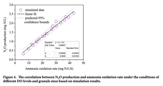 5 不同溶解氧和顆粒大小下的N2O產生和氨氧化速率:數據來自圖3和圖4。研究意義是評估關鍵操作參數對N2O產生的全局影響,建立N2O與氨氧化速率的線性關系,為實際反應器優化提供理論支持。