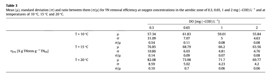 1. 總氮去除效率數據:來自Fig. 6和Table 3。數據顯示總氮去除效率隨供氧量與進水總凱氏氮之比(RO)的增加先升高后降低,且在較高溫度下,達到最大去除效率所需的RO值也更高。研究意義在于揭示了存在一個最優的供氧范圍,超過此范圍會因促進NOB活性(需要更多碳源進行異養反硝化)和抑制缺氧區異養反硝化而降低總氮去除效率。溫度通過影響微生物活性速率來調節這一過程。