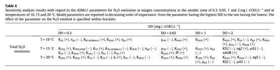 4. 模型參數敏感性排序數據:來自Table 4(總氮去除效率)和Table 6(N2O排放)。研究意義在于識別出對關鍵輸出變量影響最大的生物過程參數,例如影響總氮去除效率的主要是AOB活性、NOB活性、HB反硝化和缺氧水解作用參數;影響N2O排放的主要是HB將N2O還原為N2的步驟、HB將硝酸鹽還原為亞硝酸鹽的步驟、AOB反硝化和NOB活性的參數。這為了解模型的關鍵不確定性和后續校準方向提供了依據。