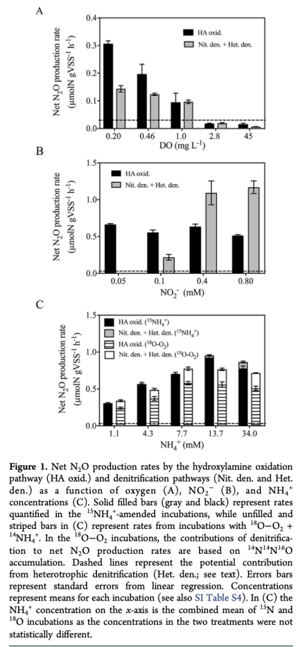 2 NO2-濃度對N2O生產途徑的影響數據:來自Figure 1B。數據顯示硝化菌反硝化途徑的N2O生產與NO2-濃度正相關,在低O2下飽和于約0.5 mM NO2-,而羥基胺氧化途徑不受NO2-影響。研究意義在于揭示了NO2-可用性在低O2下限制硝化菌反硝化,強調了控制NO2-積累對減少N2O的重要性。
