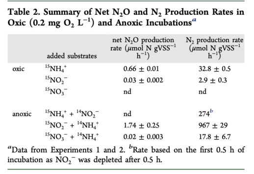 1 O2濃度對N2O生產速率的影響數據:來自Figure 1A和Table 2。數據顯示凈N2O生產速率與O2濃度呈負相關,低O2(如0.2 mg L-1)刺激羥基胺氧化和硝化菌反硝化途徑。研究意義在于確認O2是控制N2O生產的關鍵因素,低O2條件會顯著增加N2O排放,這指導了通過調節曝氣策略來減排N2O。