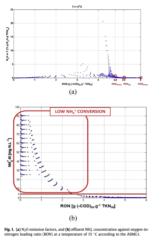 1 N2O排放因子數據:來自Fig. 1a和Table 5。數據顯示N2O排放因子隨氧負荷比(RON)的變化,在特定RON值下達到最小。研究意義在于確定了最小化N2O排放的最佳操作點,并為控制器設定點的確定提供了依據,表明通過調節氧氣供應可以有效控制N2O生產。