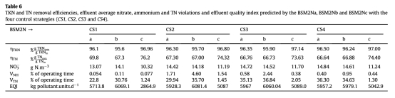 4 不同控制策略下的N2O路徑貢獻數據:來自Table 5。數據顯示了在不同控制器配置下,由AOB反硝化、不完全羥胺氧化和HB反硝化產生的N2O量。研究意義在于驗證了控制器在抑制主要N2O生產途徑(尤其是AOB反硝化)方面的有效性,并揭示了控制器性能對主導N2O生產機制的依賴性。