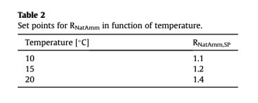 5 溫度對RNatAmm設定點影響數據:來自Table 2和Fig. 7。數據顯示了不同溫度下RNatAmm的最佳設定點(如10°C時為1.1,15°C時為1.2,20°C時為1.4)。研究意義在于表明控制器需要通過溫度自適應模塊調整設定點,以應對季節性變化,維持全年最優性能。