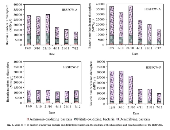 3 氮循環細菌數量數據:來自Fig.5,顯示根際和非根際的氨氧化細菌、亞硝酸鹽氧化細菌和反硝化細菌數量。研究意義在于驗證根際硝化細菌數量顯著高于非根際,反硝化細菌在非根際更豐富,說明微生物群落分布受植物調控,直接影響氮轉化路徑,為濕地微生物管理提供基礎。