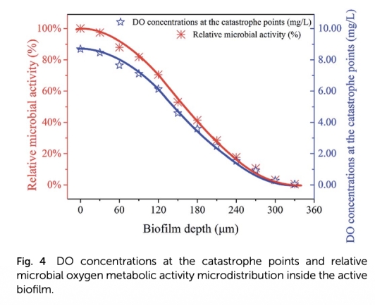3 相對微生物氧代謝活性微分布數據:基于災變點計算了相對活性隨生物膜深度的變化,來自Fig. 4。研究意義是提供了生物膜內部活性分布的直觀視圖,與已有微生物分布研究一致,驗證了方法的可靠性。