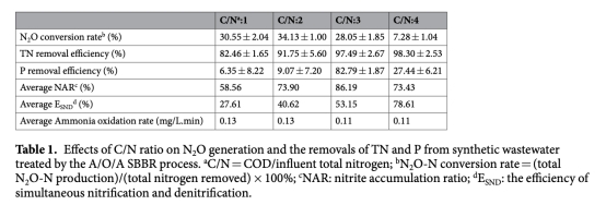 1 N2O轉換率、總氮去除效率和磷去除效率等數據,來自Table 1。研究意義是揭示C/N比對N2O生成和污染物去除的綜合影響,顯示高C/N比(如4)可顯著降低N2O排放(轉換率僅7.28%),同時提高脫氮效率(98.30%),但磷去除效率不穩定,為優化C/N比提供依據。