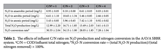 2 N2O在厭氧、好氧和缺氧期的產量數據,來自Table 2。研究意義是量化不同階段N2O貢獻,表明好氧期是主要排放源(如C/N=2時10.65mg/L),且C/N=2時總排放最高(16.71mg/L),幫助識別關鍵控制環節。