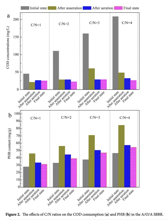 3 COD消耗和PHB含量變化數據,來自Figure 2。研究意義是證明C/N比影響碳源存儲和利用,高C/N比(如4)增加PHB積累(38.10mg/g),促進反硝化,減少N2O排放,闡明碳可用性與微生物活性的關系。