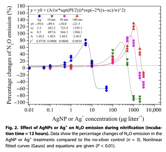 2 N2O排放變化數據:監測了AgNPs暴露下N2O排放的劑量-效應關系,來自Figure 2。研究意義是發現了AgNPs對N2O產生的毒物興奮效應(低劑量刺激最高達125.3%,高劑量抑制),表明環境濃度AgNPs可能顯著增強溫室氣體排放,對全球氮循環和氣候變化預測有重要啟示。