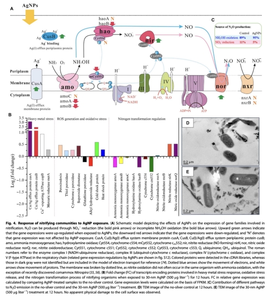 4 基因表達數據:通過宏轉錄組學獲得了硝化功能基因(如amoA, norQ)的表達譜,來自Figure 4。研究意義是發現AgNPs暴露下amoA基因表達下調1.4倍(與硝化抑制吻合),而norQ基因表達上調1.4倍(與N2O產量增加一致),從分子機制上解釋了AgNPs對硝化作用和N2O產生的雙重影響。