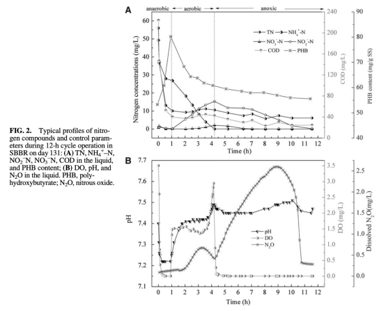 2 典型周期內氮化合物和控制參數數據:監測了典型周期中pH、溶解氧、氮化合物濃度、PHB含量和溶解N2O的動態變化,來自圖2。研究意義是揭示好氧期同步亞硝化-反亞硝化和缺氧期PHB驅動反亞硝化的具體過程,表明PHB消耗與N2O產生相關,闡明氮去除路徑和N2O排放關鍵點。