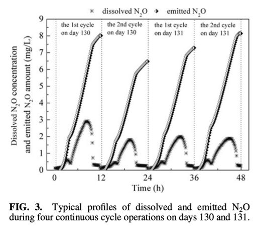 3 溶解和排放N2O濃度數據:記錄了連續周期中溶解N2O濃度和排放量,來自圖3。研究意義是量化N2O產生量(好氧期2.19±0.67 mg/L,缺氧期5.55±0.73 mg/L),顯示缺氧期是N2O主要排放階段,強調PHB驅動反亞硝化對N2O排放的貢獻。
