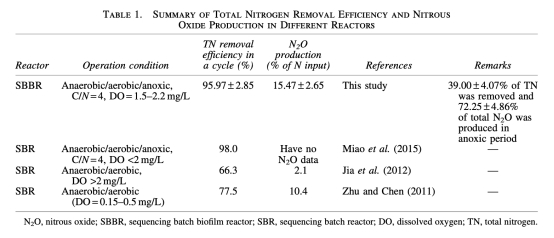 5 氮去除和N2O生產比較數據:總結了不同反應器條件下的總氮去除效率和N2O生產,來自表1。研究意義是通過對比顯示A/O/A SBBR在提高氮去除效率的同時導致更高N2O排放(15.47±2.65%),突出工藝的環境權衡。