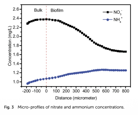 3 生物膜內部氮轉化微剖面數據:使用微電極測量硝酸鹽和銨在生物膜內的空間濃度分布,來自圖3。研究意義是直接揭示硝酸鹽消耗主要發生在生物膜外層,銨生產速率低,證明反硝化主導,微觀驗證系統機制。