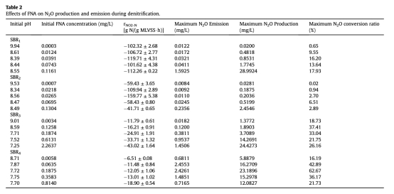 3 FNA對N2O轉化率影響數據:分析了初始FNA濃度(0.0003-2.2637 mg/L)與N2O轉化率(最高62.67%)的關系,來自表2。研究意義是揭示FNA抑制N2O還原酶活性,導致N2O積累,為調控pH和亞硝酸鹽濃度以降低排放提供理論依據。