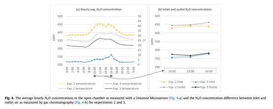 1. 測(cè)量了N2O濃度使用丹麥Unisense電極和氣體色譜法,數(shù)據(jù)來(lái)自Fig.4,顯示開(kāi)放室內(nèi)N2O濃度隨時(shí)間變化,峰值出現(xiàn)在中午高溫時(shí)。研究意義是能夠連續(xù)監(jiān)測(cè)排放動(dòng)態(tài),捕捉溫度相關(guān)的變化,從而更準(zhǔn)確量化排放因子,改進(jìn)生命周期評(píng)估的輸入?yún)?shù)。