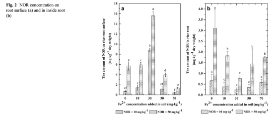 6 諾氟沙星濃度在根際和非根際土壤數(shù)據(jù)來(lái)自Fig. 6,研究意義是比較根際效應(yīng),顯示根際積累更多諾氟沙星,因鐵氧化物吸附,突出根際過(guò)程對(duì)污染物遷移的影響。