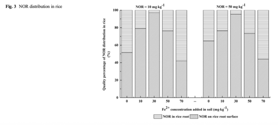3 諾氟沙星分布百分比數(shù)據(jù)來(lái)自Fig. 3,研究意義是揭示諾氟沙星在根部的分配,顯示鐵膜促進(jìn)表面積累,減少內(nèi)部轉(zhuǎn)運(yùn),強(qiáng)調(diào)鐵膜對(duì)污染物滯留的作用。