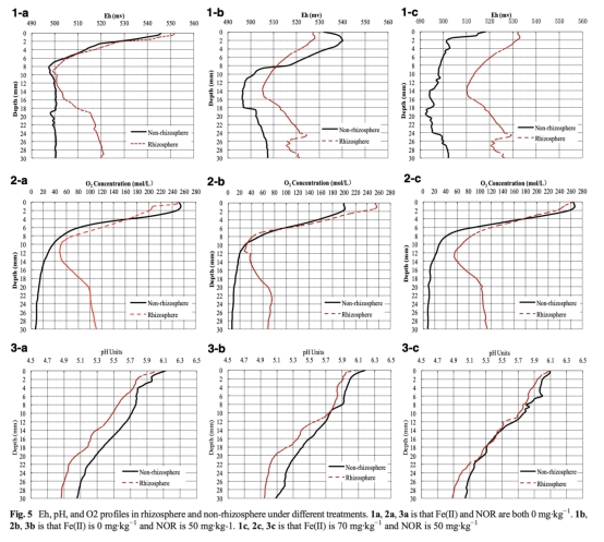 5 Eh、pH、O?剖面數(shù)據(jù)來(lái)自Fig. 5,使用丹麥Unisense電極測(cè)量,研究意義是量化根際氧化還原條件,顯示根際Eh和O?高于非根際,表明根氧化影響鐵膜形成和諾氟沙星行為。
