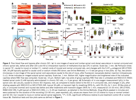 研究采用大鼠慢性脊髓損傷模型(如骶骨橫斷或胸段挫傷),通過體外和體內實驗,測量毛細血管直徑、血流速度、氧氣分壓(pO2)、運動功能(EMG)等參數。使用免疫標記、顯微鏡成像、藥物干預(如AADC抑制劑NSD1015、受體拮抗劑GR127935)和氣體處理(如高氧吸入),分析周細胞AADC表達、痕量胺產生及其對血流和運動的影響。思路是通過比較損傷組和對照組,驗證周細胞介導的血管收縮機制。