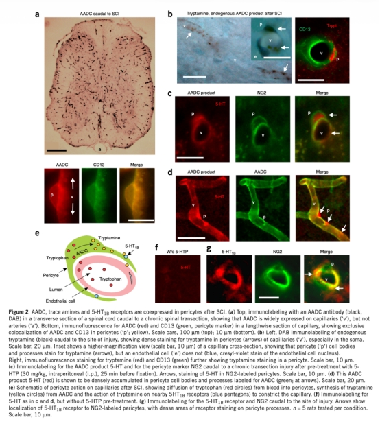 論文摘要指出,中樞神經系統血管受神經元活動控制,脊髓損傷后,損傷部位以下的脊髓因單胺神經支配丟失,導致血管張力適應異常。研究發現,慢性脊髓損傷后,脊髓處于慢性缺氧狀態,原因是周細胞上單胺受體(如5-HT1B)在缺乏單胺的情況下被痕量胺(如色胺)過度激活,導致毛細血管收縮,血流減少至缺血水平。痕量胺由周細胞異位表達的芳香族L-氨基酸脫羧酶(AADC)從飲食氨基酸(如色氨酸)合成。抑制單胺受體或AADC,或增加吸氧,可緩解缺氧并改善運動神經元和運動功能。