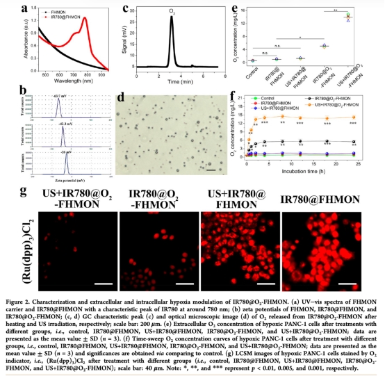2 體外氧釋放數(shù)據(jù)來(lái)自圖2c,d,e,f,通過(guò)GC、光學(xué)顯微鏡和Unisense電極測(cè)量,顯示IR780@O2-FHMON在超聲波照射下能有效釋放氧氣,提高細(xì)胞外和細(xì)胞內(nèi)氧氣濃度,研究意義是證明納米平臺(tái)能主動(dòng)緩解缺氧,為SDT提供充足氧氣底物。