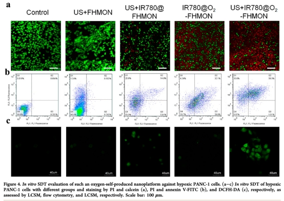 4 細(xì)胞毒性數(shù)據(jù)來(lái)自圖4,通過(guò)CCK8 assay、PI/Calcein AM染色和流式細(xì)胞術(shù)(凋亡檢測(cè)),顯示IR780@O2-FHMON結(jié)合超聲波能顯著誘導(dǎo)缺氧PANC-1細(xì)胞凋亡,研究意義是證實(shí)納米平臺(tái)通過(guò)緩解缺氧打破SDT抵抗,提高治療效率。